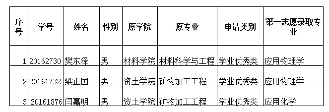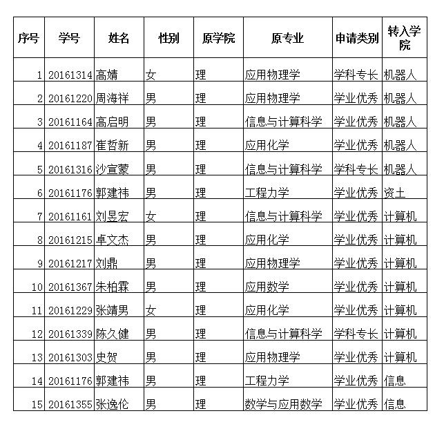 理学院2016级转出学生名单