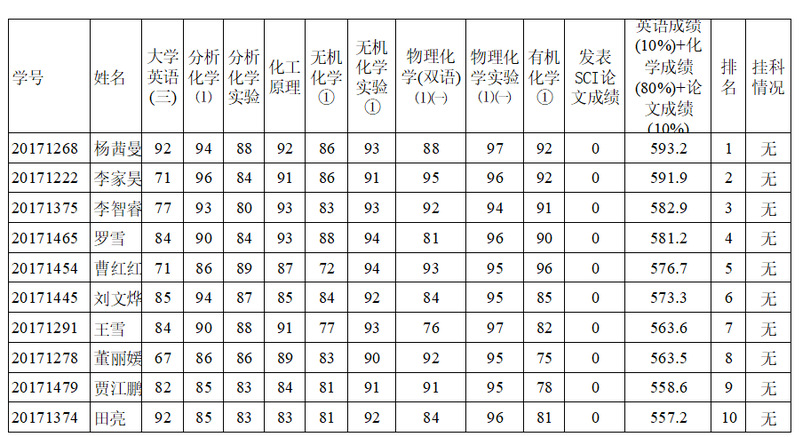 2017级应用化学专业方肇伦实验班再选拔公示材料(建设方案,补充选拔说明,2017级非方班学生成绩前10名)