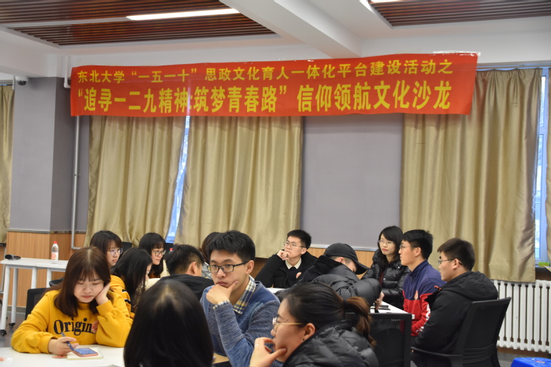 为贯彻落实学校、学院“不忘初心、牢记使命”主题教育方案要求,弘扬传承“一二·九”运动精神,加强党员爱国主义教育,培育历史责任感和时代使命感,理学院组织开展“追寻一二·九精神,筑梦青春路”为主题的第五季第六期主题沙龙活动,马克思主义学院副教授赵浚担任嘉宾,研究生的部分党员、本科生积极分子代表参加活动,该活动是东北大学“一五一十”思政文化育人一体化平台建设项目之一。