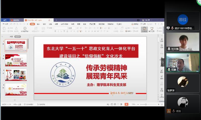 为深入学习习近平新时代中国特色社会主义思想和党的十九大精神,全面贯彻《关于全面加强新时代大中小学劳动教育的意见》,培养学生热爱劳动、尊重劳动的精神,培育德智体美劳全面发展的新时代大学生。5月26日,理学院通过腾讯会议,组织开展以“传承劳模精神,展现青年风采”为主题的第六季第二期沙龙活动。东北大学马克思主义学院副院长、教授任鹏老师,理学院本科生辅导员岳登晓老师、张梦洋老师,研究生部分党员和本科生入党积极分子参加活动,该活动是东北大学“一五一十”思政文化育人一体化平台建设项目之一。