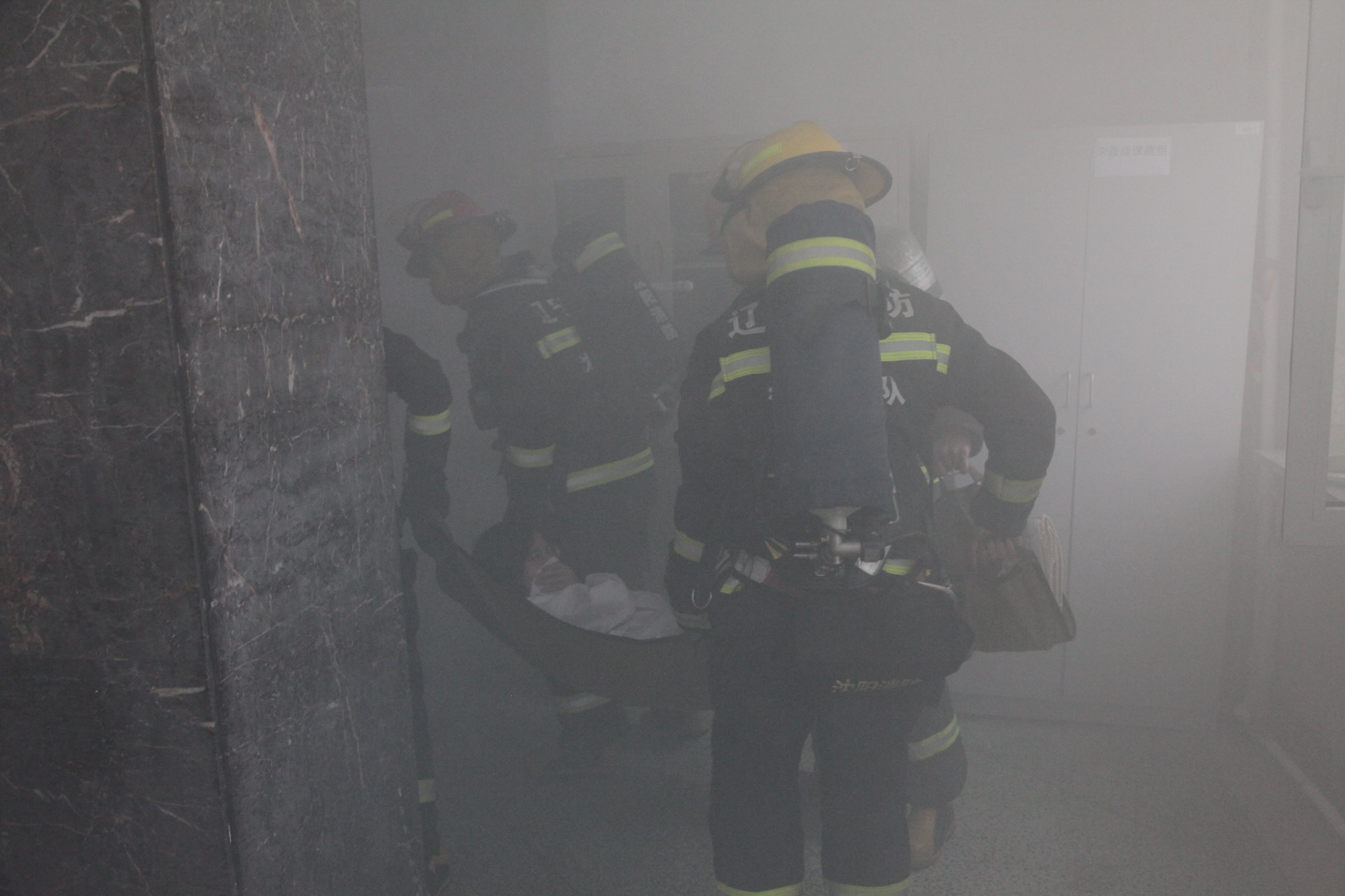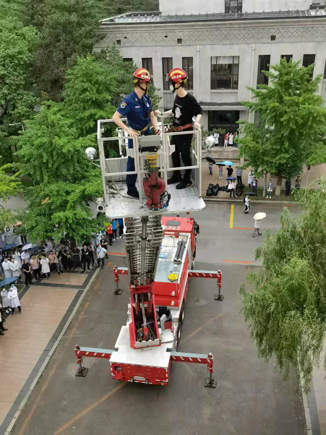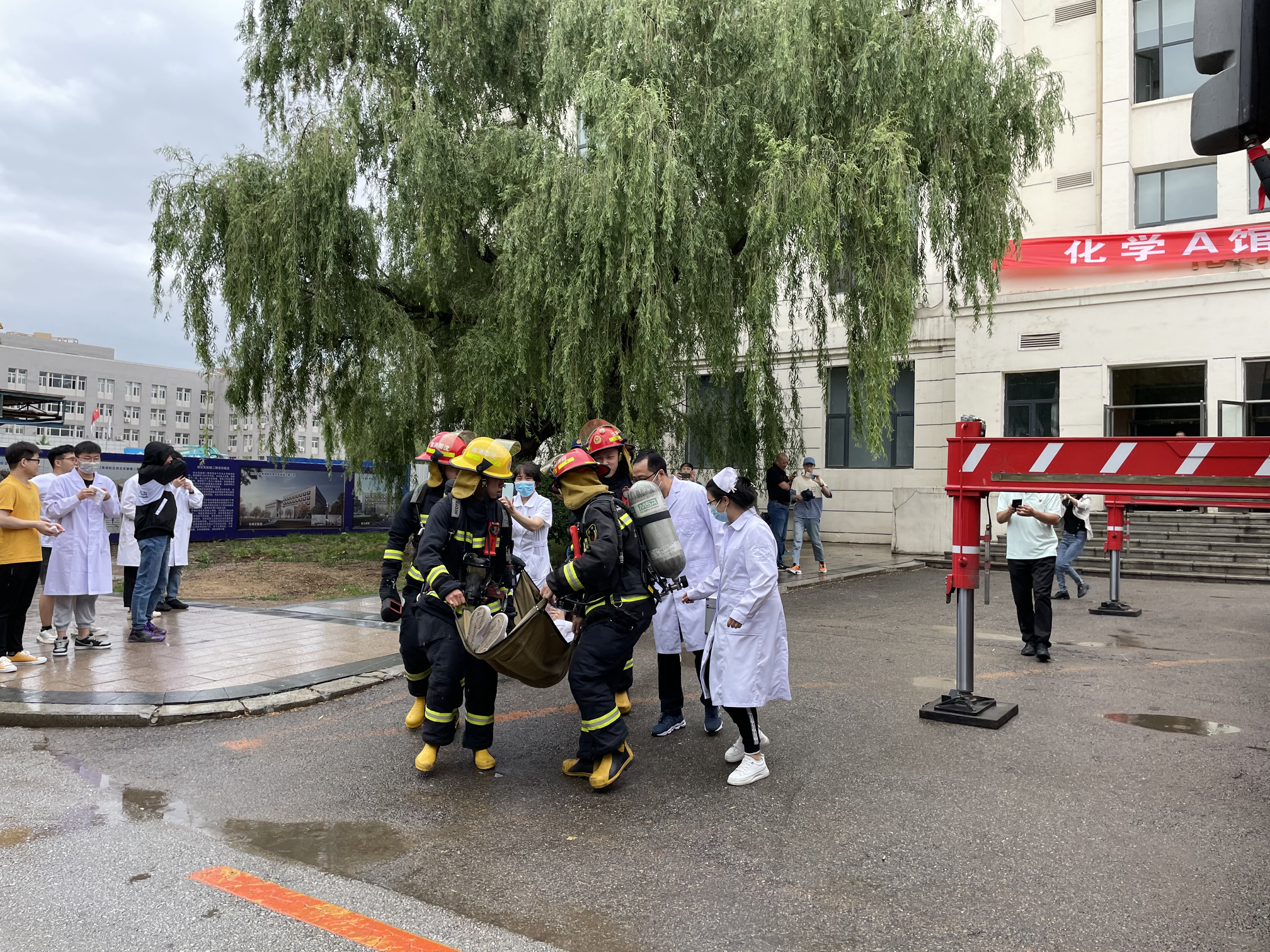 化学A馆消防疏散逃生演练模拟楼内发现火情场景,某同学迅速报告房管员,并拨打公安处报警电话。化学A馆火警警报响,全馆进入紧急疏散状态,全体师生用湿毛巾捂住囗鼻从最近的逃生通道逃生,快速有序地到达指定安全位置。与此同时,公安处工作人员第一时间到达起火位置进行初期火灾处置、拨打辖区消防指挥中心电话模拟报警,消防队员在化学A馆外围做好安全警戒工作。同时进行现场解救受困人员、消防员灭火的演示。消防队员现场演示高空救援和伤者救助。师生在整个演练过程中真实体验了如何报警和火场逃生,掌握了必备的消防安全常识和自救逃生技能。