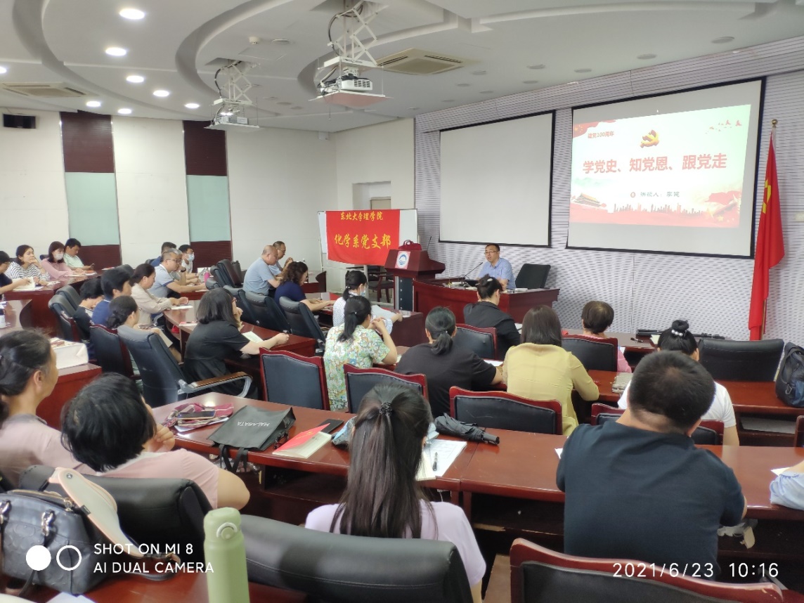 2021年6月23日,在中国共产党百年华诞之际,在学院领导的关怀和支持下,化学系党支部面向化学系全体教师开展了“学党史,知党恩,跟党走”主题党课教育活动,理学院副院长李健出席了此次活动,并给全体化学系教师讲授了一堂精彩而深刻的党课。