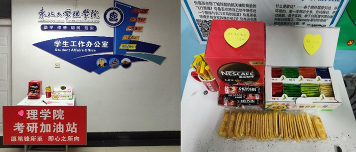 11月26日,学院在三舍C区、四舍寝室楼下置备了“考研加油站”,放置咖啡茶点,考研心愿贴等物资,帮助考研同学调整心态、舒缓压力。