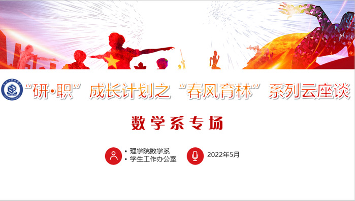 五一假期期间,由理学院数学系与学生工作办公室联合举办的“研·职”成长计划之“春风育林”系列云座谈数学系专场成功举办。本次座谈由院团委书记李博主持,数学系领导班子成员、相关年级班导师及辅导员、数学专业大一大二全体同学参加本次座谈。