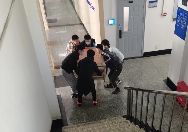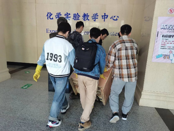 在化学系有这样一群研究生党员,他们冲锋在前在封校期间协助各单位老师进行日常的疫情防控工作、实验室安全管理工作以及其他各项事务。疫情封校期间,化学系分析化学博士生党员充分发挥自己的先锋模范作用,主动承担502会议室的卫生清扫工作;本科教学购买的设备无法配送入校,无机化学研究生党员就用小车将设备从北门运到化学B管,再将其抬到相应的楼层,16台仪器设备就这样通过研究生党员的双手安稳安全的到达了目的地。