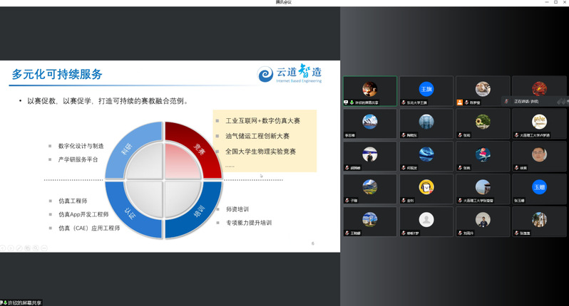 北京云道智造科技有限公司刘高升总裁介绍了公司的发展历程和目标方向,也提出了在高校人才培养方面的合作方式;云道智造流体仿真工程师张桃介绍了仿真软件Simdroid并演示了仿真APP的开发过程;云道智造项目总监胡国峰介绍了高校学生进行线上生产实习的项目方案;云道智造仿真赛事产品总监许欣博士介绍了第三届中国工业互联网大赛·“工业互联网+数字仿真”专业赛、全国油气储运工程数值仿真技能创新大赛等赛事的组织情况。