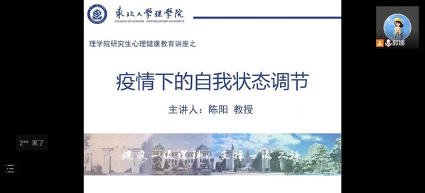 5月31日,理学院举办研究生心理健康教育讲座,邀请东北大学心理健康教育中心主任陈阳教授作题为《疫情下的自我状态调节》的线上讲座,全体研究生参加此次讲座。