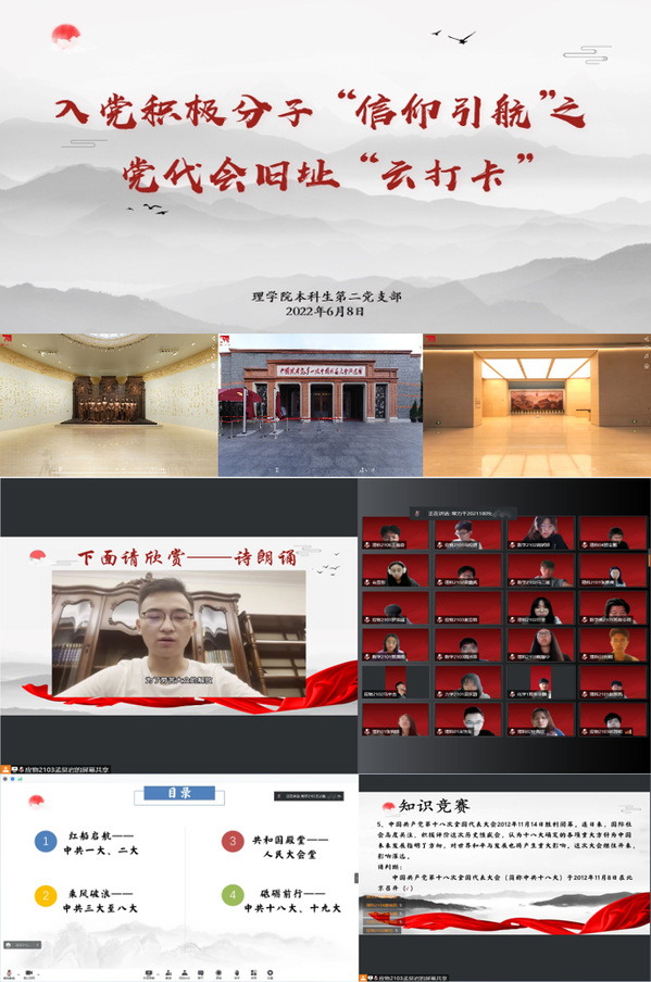 6月8日,理学院于线上开展入党积极分子“信仰引航”之党代会旧址“云打卡”活动,院党委组织员郝冬梅、本科生第二党支部书记李博、2021级本科生辅导员姜玥以及支部所属入党积极分子参加本次活动。