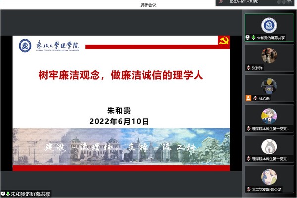 6月10日,理学院通过腾讯会议开展毕业生“最后一次党课”主题教育活动。本次党课由理学院党委副书记、纪委书记朱和贵主讲,本科生第一党支部书记、2018级本科生辅导员张梦洋及2022届毕业生党员参加党课学习。