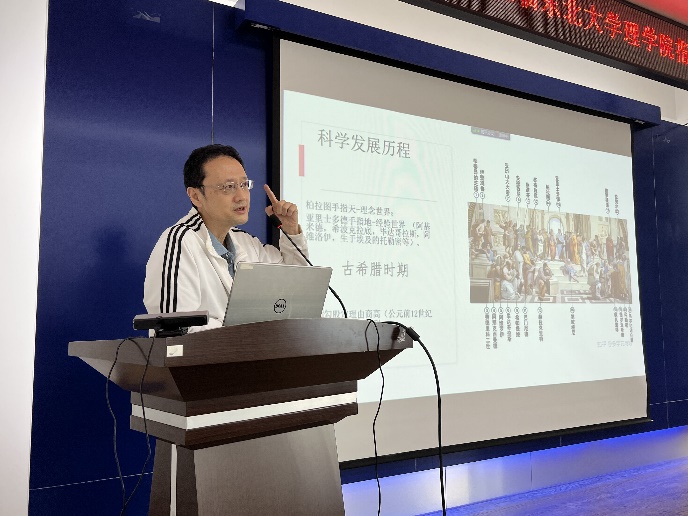 王泉院士以“科学漫谈”为主题进行了长达两个半小时的讲座。他首先抛出了“我们近20年的学生生涯,除了课程教授的知识外,深刻印在我们头脑和思想中的究竟应该是什么” 以及“我们的教育或教学生涯,除了课本知识,带给学生的应该是什么?他们毕业后应该成为什么样的人?教育或教学对我意味着什么?”这两个开放问题,然后通过讲述科学本质、发展及方法等方面探讨究竟如何能够在学习中产生强大的思想力量。王泉院士鼓励师生应该积极努力地去探究人生的意义,并指出科学体系的建立是后人在前人的基础上不断完善、不断摸索的结果。王泉院士生动丰富的讲座吸引了全体参会师生的浓厚兴趣。最后,王泉院士与参会师生进行了热烈的讨论交流。