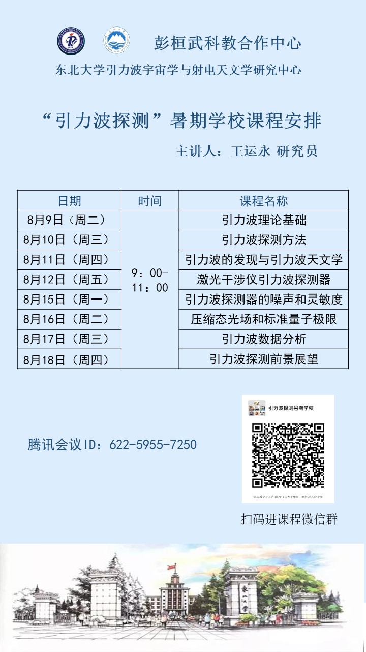 2022年8月9-18日,东北大学理学院成功举办“引力波探测”暑期学校。本次暑期学校由中科院理论物理研究所-东北大学彭桓武科教合作中心和东北大学引力波宇宙学与射电天文学研究中心联合主办。暑期学校荣幸邀请到了中国科学院高能物理研究所王运永研究员进行授课。由于疫情原因,课程采取线上研讨的方式进行,来自东北大学、中国科学院国家天文台、中国科学院理论物理研究所、中国科学院高能物理研究所、北京师范大学、华中师范大学、重庆邮电大学、河北师范大学、沈阳航空航天大学、沈阳师范大学、西华师范大学等国内多所高校及科研院所近200位学员(包括科研人员以及研究生和本科生)参加了此次暑期学校。
