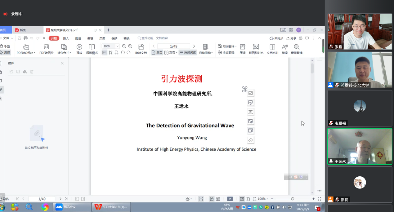 2022年8月9-18日,东北大学理学院成功举办“引力波探测”暑期学校。本次暑期学校由中科院理论物理研究所-东北大学彭桓武科教合作中心和东北大学引力波宇宙学与射电天文学研究中心联合主办。暑期学校荣幸邀请到了中国科学院高能物理研究所王运永研究员进行授课。由于疫情原因,课程采取线上研讨的方式进行,来自东北大学、中国科学院国家天文台、中国科学院理论物理研究所、中国科学院高能物理研究所、北京师范大学、华中师范大学、重庆邮电大学、河北师范大学、沈阳航空航天大学、沈阳师范大学、西华师范大学等国内多所高校及科研院所近200位学员(包括科研人员以及研究生和本科生)参加了此次暑期学校。