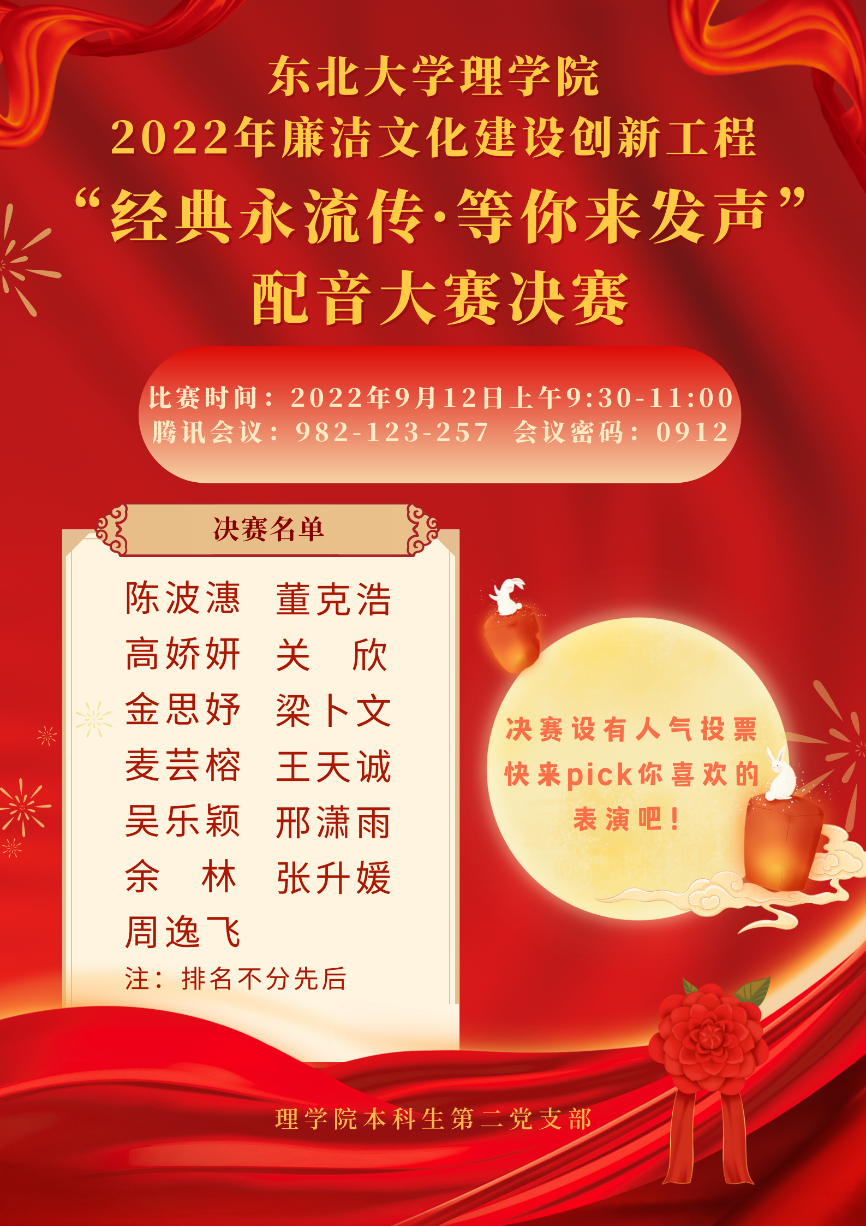 为深入贯彻落实2022年东北大学“廉洁文化建设创新工程”的相关要求,加强反腐倡廉建设、营造廉洁文化氛围,理学院于8月7日至9月12日举办“经典永流传·等你来发声”主题配音大赛。