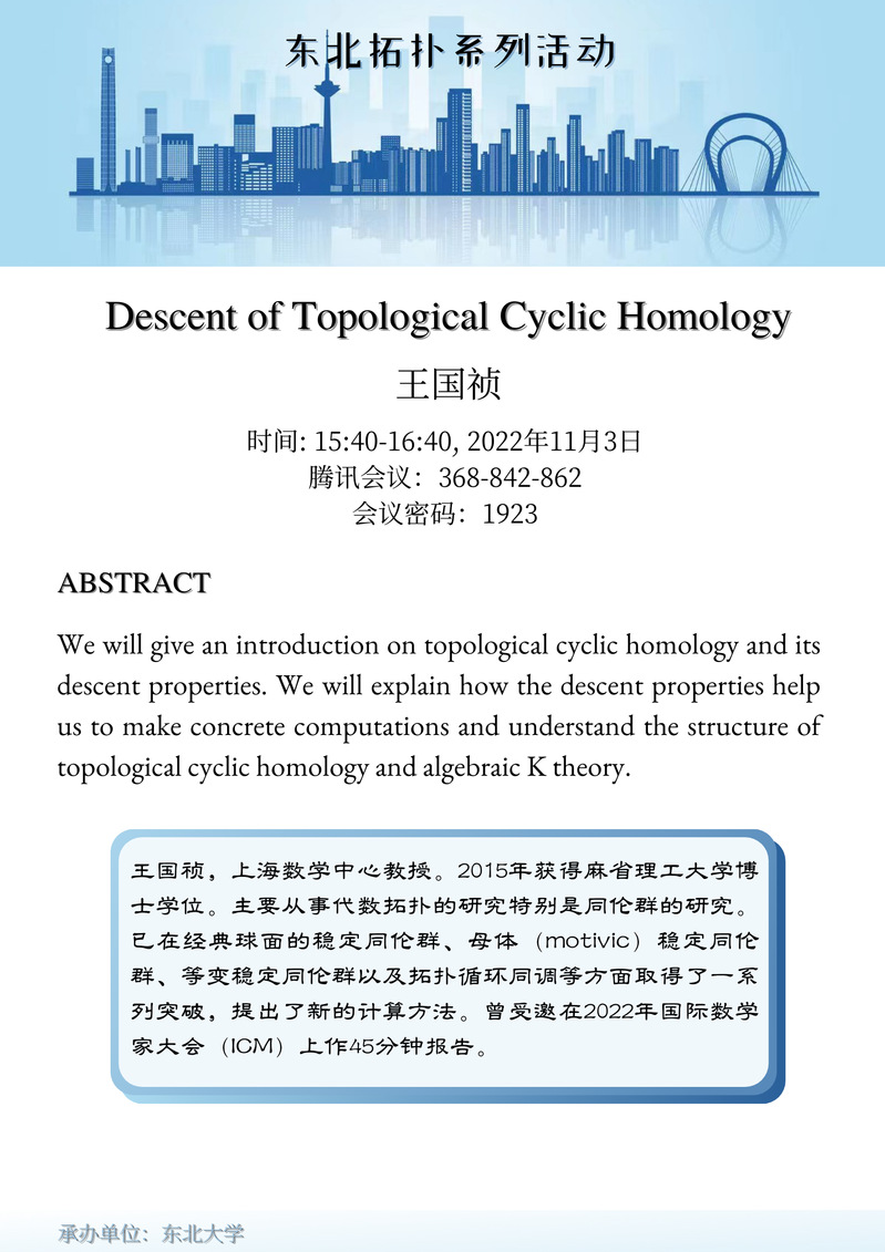 2022年11月3日的主讲人为上海数学中心王国祯教授,报告题目为: Descent of Topological Cyclic Homology.