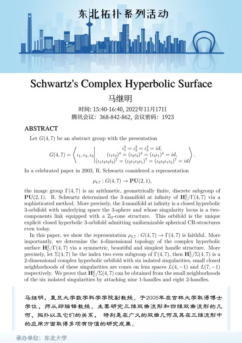 2022年11月14日的主讲人为复旦大学数学科学学院马继明教授,报告题目为: Schwartz’s complex hyperbolic surface.