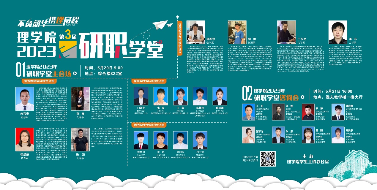 5月20日至21日,理学院成功举办“不负韶华,携理启程”第三届研职学堂。本次研职学堂设置开幕式、主会场、咨询会三部分,邀请理学院不同学科教师和各专业的优秀学生,按照多层级、多方向、多角度的形式组织开展,旨在帮助本科生树立学业规划的意识,养成科学的学习习惯,形成严谨务实的学风。