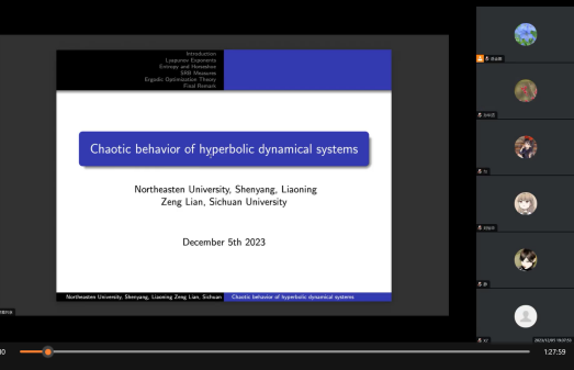 12月5日,四川大学数学学院副院长连增教授应东北大学数学与交叉科学研究中心邀请作“Chaotic behavior of hyperbolic dynamical systems”为题的线上学术报告。报告会由中心主任孙华清教授主持,理学院张雪教授及部分教师、研究生、本科生,山东大学李静教授及部分教师、研究生,山东师范大学等师生参加。