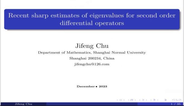 为加强校际学术交流,提高师生科研视野,提升东北大学数学学术氛围,12月4日东北大学数学与交叉科学研究中心邀请上海师范大学数学系储继峰教授为我院数学系师生作“Recent sharp estimates of eigenvalues for second-order differential operators”的线上学术报告。报告由中心主任孙华清教授主持,数学系张国伟教授、赵晓朋教授及部分教师、研究生、本科生参加。