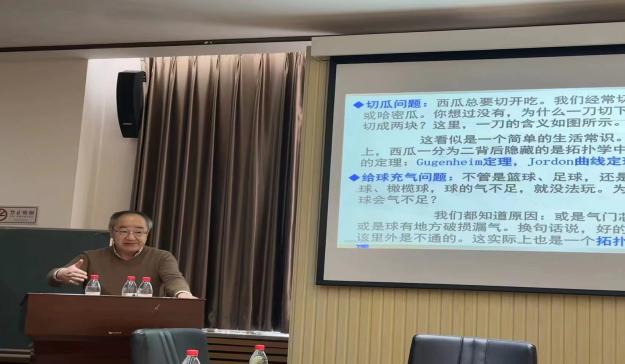 雷逢春教授的报告聚焦现实生活中的应用,从切瓜、纽结以及布线等实际场景应用出发,对“什么是拓扑学”进行了具体介绍,然后讲述了拓扑学的主要研究方向(组合拓扑学、点集拓扑学、代数拓扑学、微分拓扑学、几何拓扑学)以及研究拓扑学的实际意义,之后回顾了低维拓扑学跨世纪的发展,即二、三和四维流形拓扑学的主要成就以及当下拓扑学的研究现状。