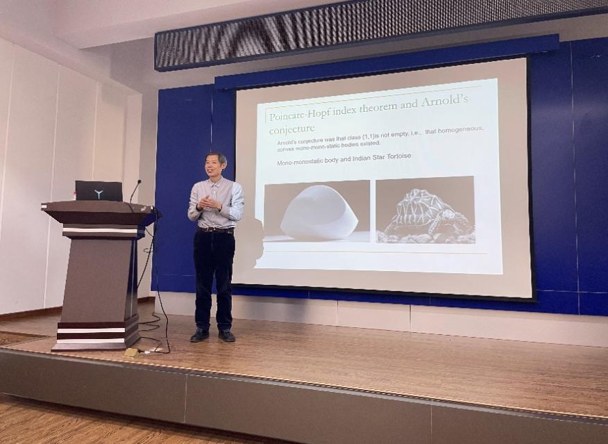 报告会上,杨教授从苏轼的故事入手,讲述了数学中的逻辑推理能力、空间想象力,他幽默的话语以及有趣的互动赢得了老师、同学们的掌声。杨教授用自己作的一首词使同学们领略了一番数学逻辑思考在诗句中的美丽,用通俗的事例让同学们了解到数学不单是简单的计算能力。他着重的讲解了数学的组成、数学在各个学科领域的运用,鼓励同学们在不同领域对重要数学知识的把握。讲座后杨教授并就教师提出的问题进行详细解答。杨教授追求“真善美”的人生态度,在为人师、做科研、品生活等各个方面展现出来,使同学们受益匪浅。