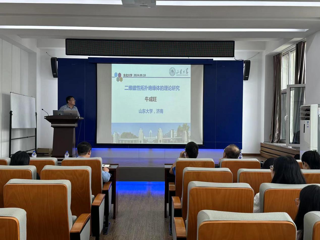 9月18日,山东大学物理学院教授、博士生导师,山东省泰山学者青年专家、山东大学齐鲁青年学者牛成旺老师应邀来校,在建筑学馆207报告厅作“二维磁性拓扑绝缘体的理论研究”的主题报告,物理系孔祥儒副教授主持,学院相关专业老师及学生参加此次报告会。