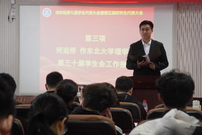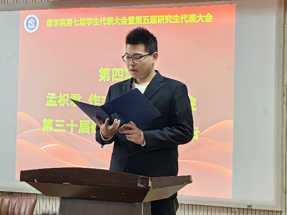 会上,何远桥同学代表理学院第三十届学生会作了题为“矢志奋斗心向党,勇担使命谱新篇”的工作报告。孟枳君代表理学院第三十届研究生会作了题为“不忘砥砺来时路,奋勇前进新征程”的工作报告。