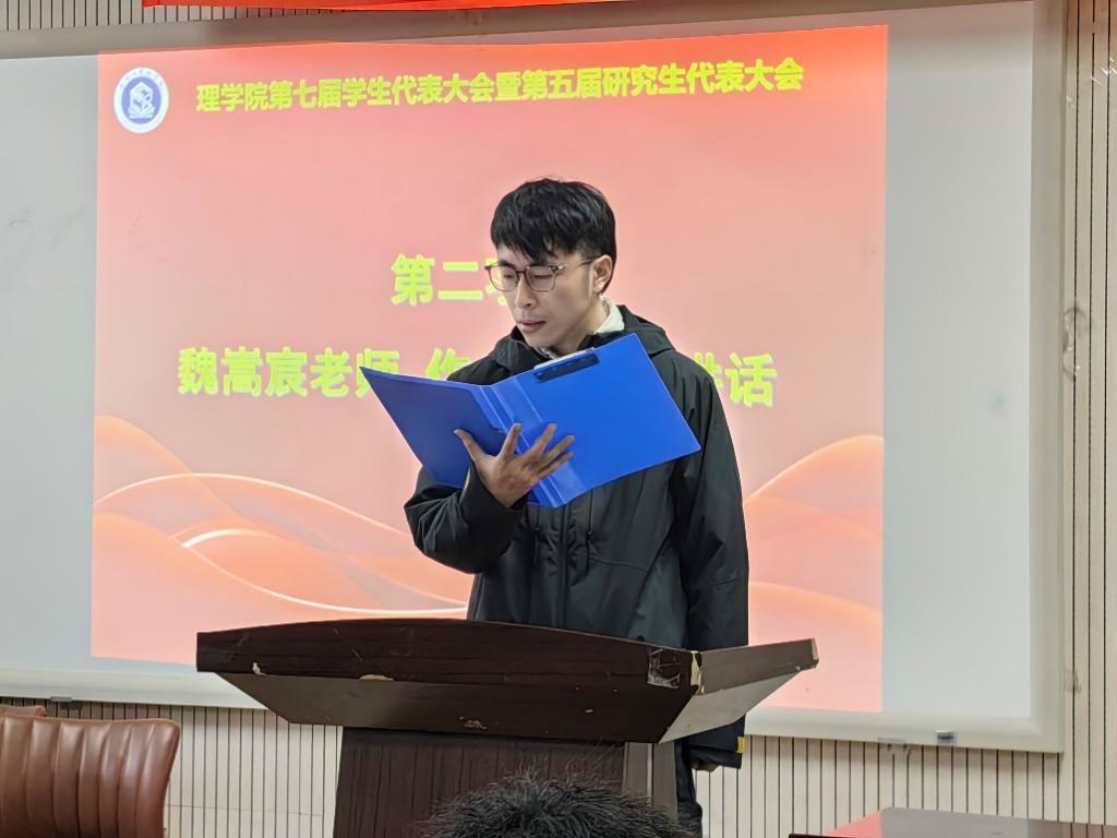 27日下午15:00,理学院第七届学生代表大会、第五届研究生代表大会开幕式在国歌声中拉开帷幕,魏嵩宸为本次会议作指导讲话。他向大会的召开表示祝贺,向出席大会的代表和全院同学致以亲切的问候,对支持学院团学工作的领导和同学表示衷心的感谢。他强调广大青年应当在学思践悟中干事创业、改革创新,扎实推进各项工作高质量发展。