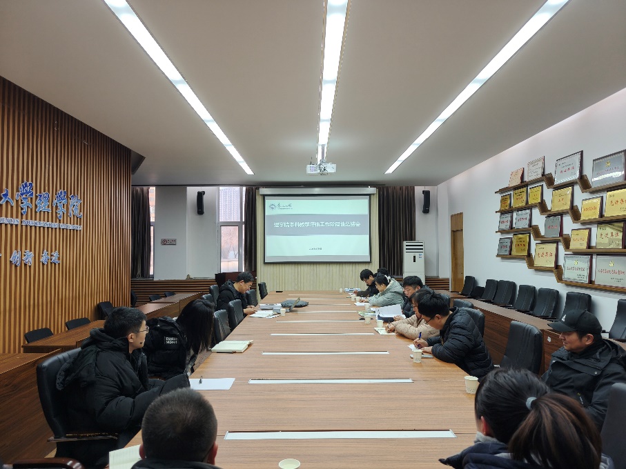 2025年1月6日,理学院在建筑馆211A召开本科教育教学评估工作阶段性总结会。学院各专业负责人、各系教学主任和教学办相关工作人员参加会议,理学院副院长王旗主持会议。