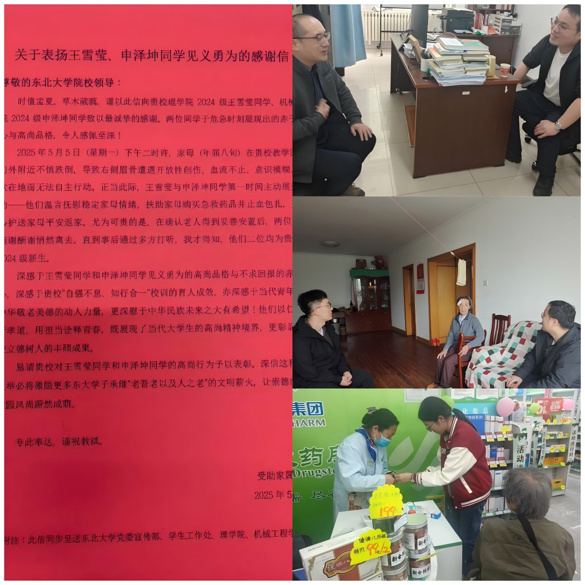 2025年5月5日下午,天空阴沉下着小雨,一场暖心的故事在校园外悄然上演!理学院2024级本科生王雪莹同学和机械学院2024级本科生申泽坤同学在校门外发现一名老人瘫软在地无法自主行动,头部血流不止,情况十分危急。面对这一突发状况,他们没有丝毫犹豫,第一时间主动展开救助!仔细检查老人伤势后,小心翼翼地扶助老人起身,迅速前往药店购买急救药品为老人止血包扎。待老人情况稍稍稳定,两位同学又紧急与家属取得联系,并一路细心护送老人平安返家。确认老人得到妥善安置后,面对家属的酬谢,他们婉言谢绝,悄然离去。事后,老人家属通过多方打听,才终于得知这两位温暖人心的东大人的名字,并向学校递交感谢信,诉说着满满的感激与敬意!
