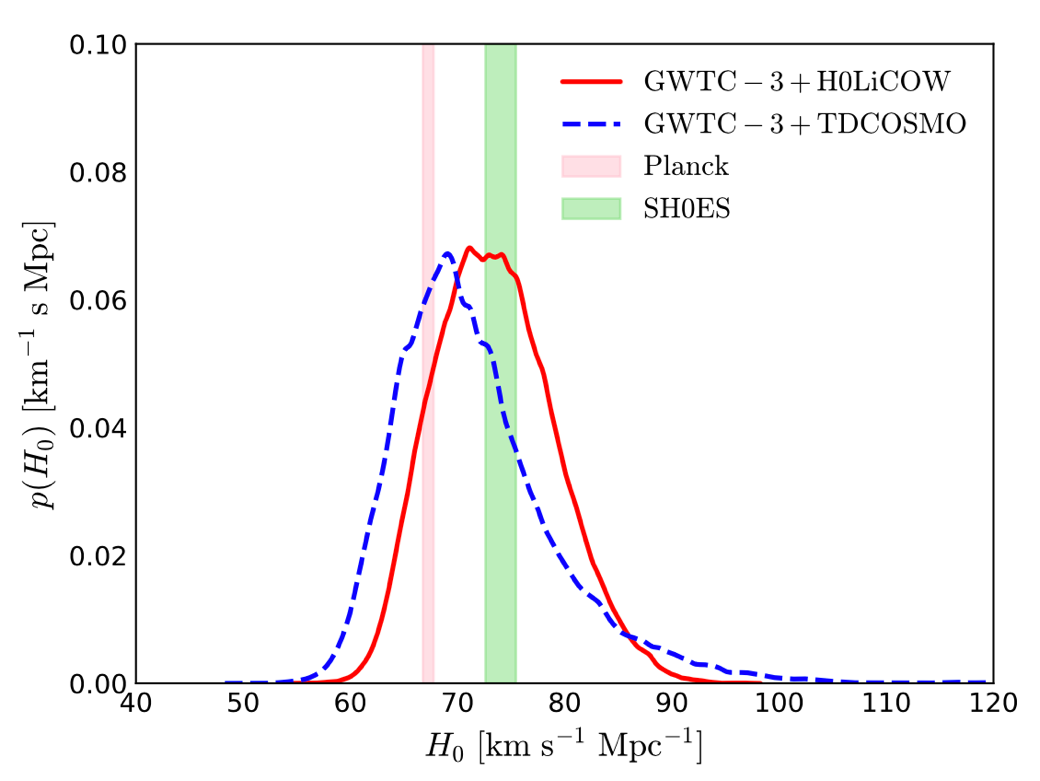 哈勃常数描述了当前宇宙的膨胀速率,其精确测定对研究宇宙的演化和基础物理规律具有重要意义。近年来,基于宇宙微波背景辐射(CMB)观测与近邻宇宙距离阶梯方法测得的哈勃常数值之间存在超过 5σ 的显著差异,已引发了新的宇宙学危机,被称为“哈勃危机”。测量的不一致性可能暗示着超出标准宇宙学模型的新物理,也可能源于测量中尚未探明的系统误差。为探究“哈勃危机”的根源,张鑫团队创新性地利用 LIGO-Virgo-KAGRA 探测网络观测到的 47 例引力波标准汽笛事件,对强引力透镜时间延迟系统 RXJ1131-1231进行了距离校准,从而通过距离求和关系对哈勃常数给出了新的、不依赖于宇宙学模型的测量值。
