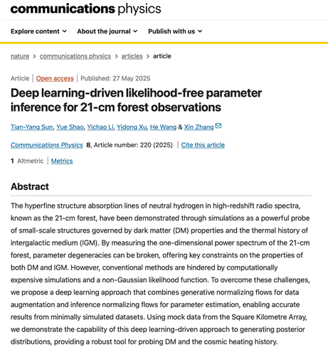 近日,理学院物理系张鑫教授团队在Nature子刊Communications Physics(《通讯–物理》)上发表21厘米宇宙学领域的最新研究成果,利用人工智能方法破解该领域的重要难题。东北大学博士研究生孙天阳为论文第一作者,张鑫教授为通讯作者。该成果是团队在21厘米森林研究方面取得的又一重大突破,其前期研究已于2023年以封面论文的形式发表于Nature Astronomy(《自然-天文》)。