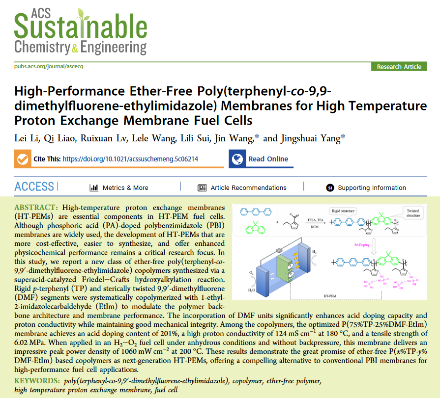 近日,东北大学理学院杨景帅副教授课题组在ACS Sustainable Chemistry & Engineering期刊发表题为“High-Performance Ether-Free Poly(terphenyl-co-9,9- dimethylfluorene-ethylimidazole) Membranes for High Temperature Proton Exchange Membrane Fuel Cells”的研究论文。东北大学理学院化学系方肇伦拔尖实验班2022级本科生李雷为文章第一作者,东北大学为该论文第一作者单位,通讯作者为杨景帅副教授。