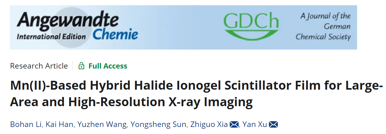 近日,东北大学理学院化学系徐燕教授团队与华南理工大学夏志国教授合作在X射线闪烁成像研究中取得重要突破,相关成果以“Mn(II)-Based Hybrid Halide Ionogel Scintillator Film for Large-Area and High-Resolution X-ray Imaging”为题,发表于化学学科国际顶级期刊ANGEW CHEM INT EDIT上。东北大学博士研究生李柏韩为本文第一作者,东北大学理学院为第一完成单位。