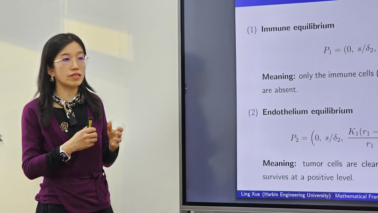哈尔滨工程大学数学科学学院的薛玲教授以“Mathematical Frameworks for Optimizing Combination Cancer Therapies:From Anti-Angiogenesis to Immunotherapy”为题,分享了其团队构建的肿瘤联合治疗优化数学框架。该框架涵盖抗血管生成药物与化疗的联合应用、mRNA疫苗与抗CTLA-4抗体的协同治疗等方向,通过精准的数学建模与分析,为个性化多模式肿瘤治疗方案的设计提供了理论依据,展现了数学在临床转化中的重要价值。
