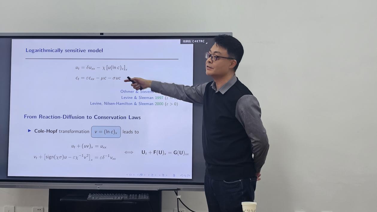 哈尔滨工程大学数学科学学院的赵昆教授围绕“Unveiling Patterns in Chemotaxis”展开报告,介绍了其团队在Keller-Segel型趋化模型研究中的最新发现,深入探讨了有限区间内稳态解的存在性与稳定性问题,为生物数学领域的非线性偏微分方程分析提供了新的思路与方法。