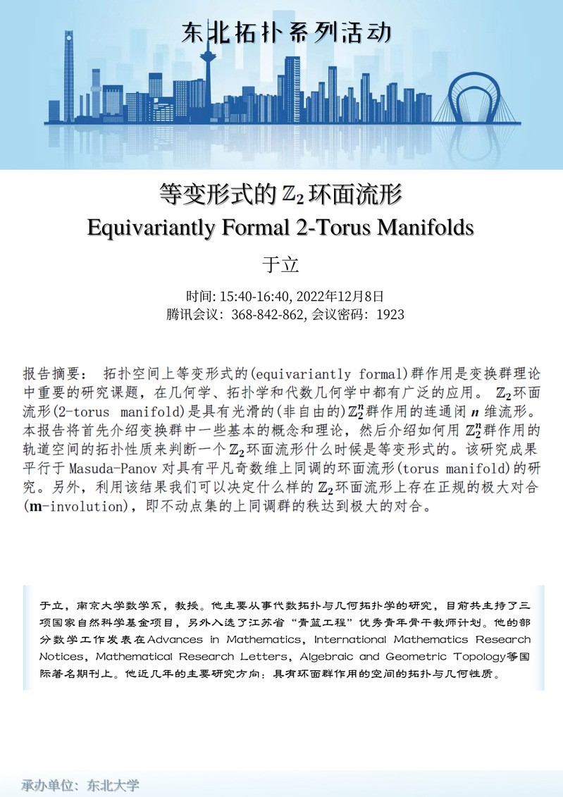 2022年12月8日的主讲人为南京大学数学系于立教授,报告题目为: Equivariantly formal 2-torus manifolds.