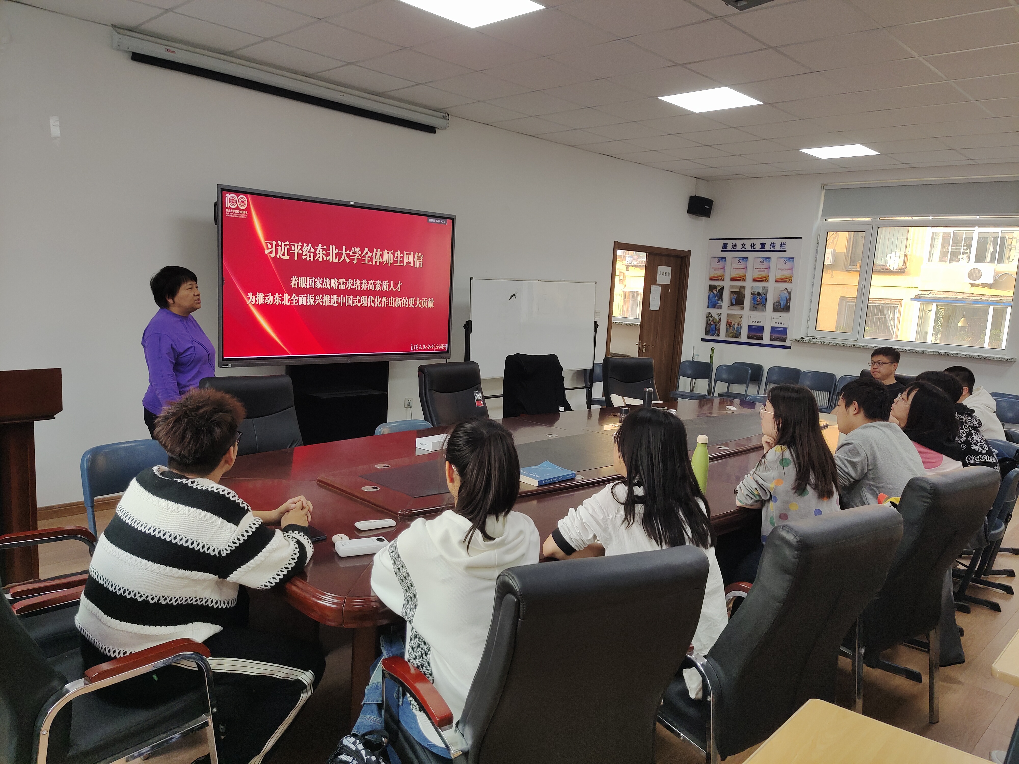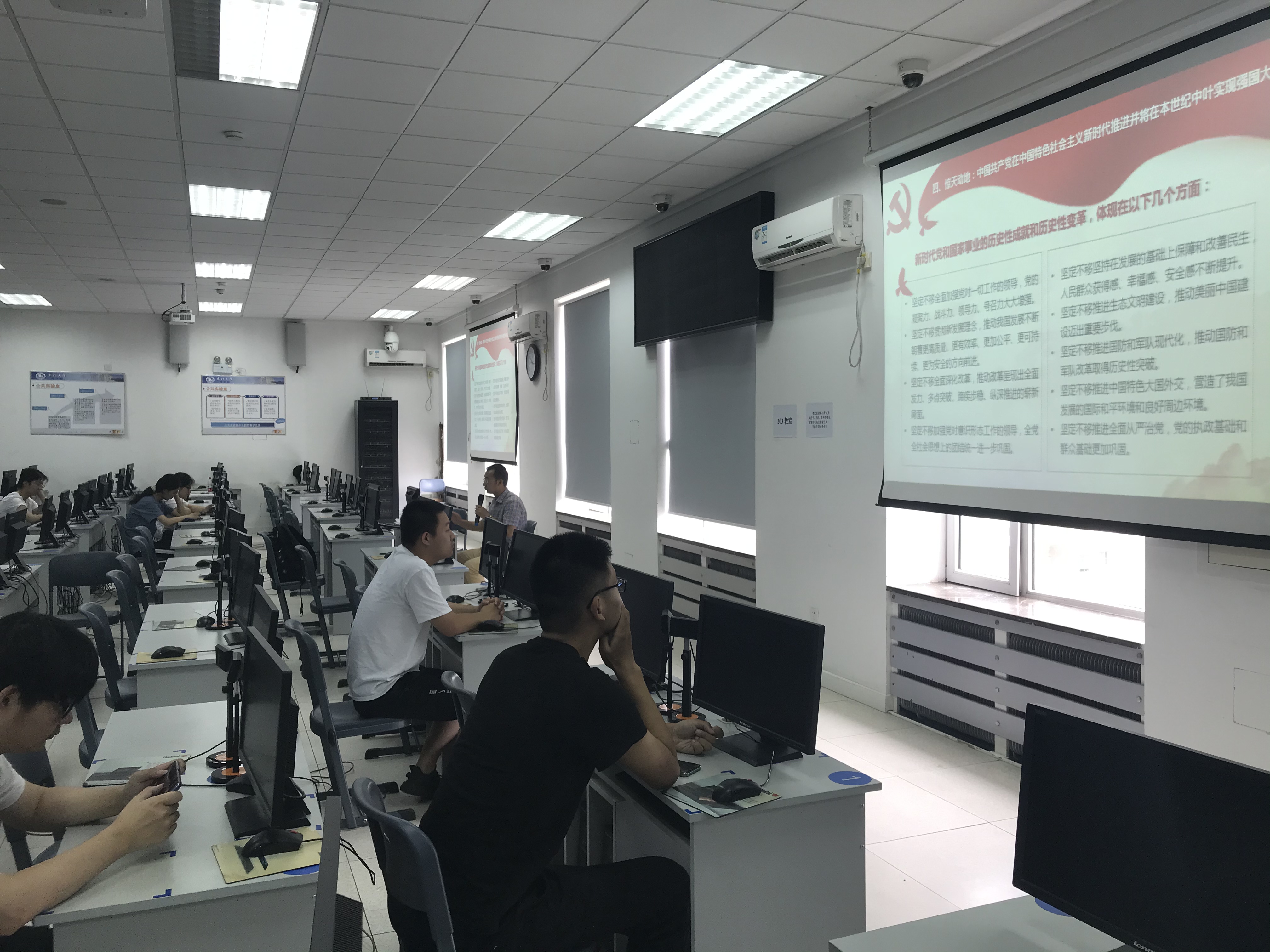 图为冯男、邵新慧为同学们做三育人活动中主题报告照片