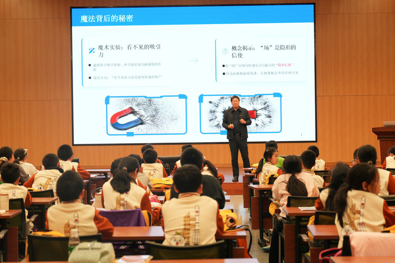讲座伊始,王旗教授并未直接抛出枯燥的公式,而是通过磁铁隔空吸引铁粉的神奇实验,瞬间抓住了学生们的眼球。王旗教授将抽象的“电磁场”生动地比喻为传递力量的“隐形信使”,引导孩子们思考为何两块磁铁不接触也能互相推拉。在互动环节中,孩子们踊跃分享生活中观察到的“静电魔法”,王旗教授则深入浅出地解码了电场与磁场的本质,让原本晦涩难懂的物理概念变得直观而有趣。本次讲座的核心亮点在于将中国科技史与科学家们的贡献巧妙融合。从中国古代四大发明之一——指南针(司南)的智慧,到突破技术瓶颈的磁悬浮列车,再到当代中国的“超级工程”——中国天眼(FAST)。王旗教授强调,这些成功的背后凝聚着无数科学家的智慧,以及科学家们的持续攻关与关键技术支撑,令学生们倍感自豪。